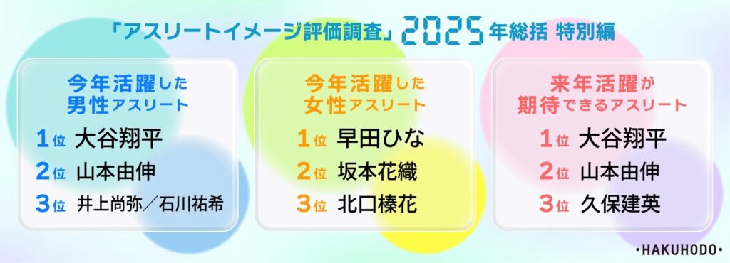 株式会社博報堂は、株式会社博報堂DYスポーツマーケティング、データスタジアム株式会社と共同で、2025年11月28日~12月1日に、アスリートの総合的なイメージを測定する「アスリートイメージ評価調査」2025年総括特別編を行いました。