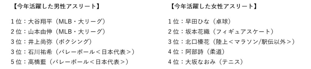 「今年活躍した」アスリートは、男性で1位:大谷翔平(MLB・大リーグ)、2位:山本由伸(MLB・大リーグ)、3位:井上尚弥(ボクシング)/石川祐希(バレーボール<日本代表>)、5位:高橋藍(バレーボール<日本代表>)となりました。女性は1位:早田ひな(卓球)、2位:坂本花織(フィギュアスケート)、3位:北口榛花(陸上<マラソン/駅伝以外>)、4位:阿部詩(柔道)/大坂なおみ(テニス)となりました。