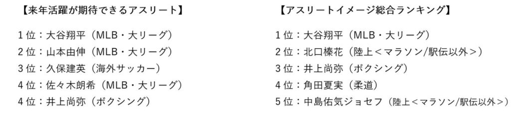 「来年活躍が期待できる」アスリートは、1位:大谷翔平(MLB・大リーグ)、2位:山本由伸(MLB・大リーグ)、3位:久保建英(海外サッカー)、4位:佐々木朗希(MLB・大リーグ)/井上尚弥(ボクシング)となり、ワールドチャンピオンとなったロサンゼルス・ドジャースの日本人選手3人が上位にランクインしました。