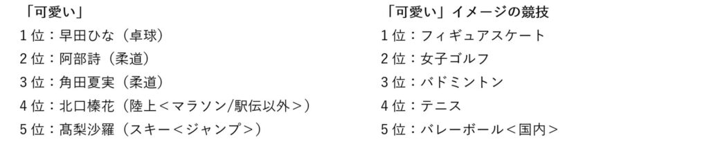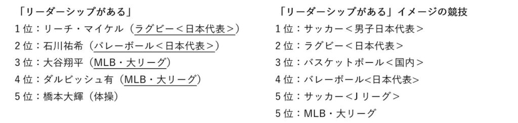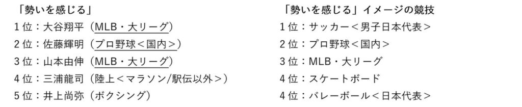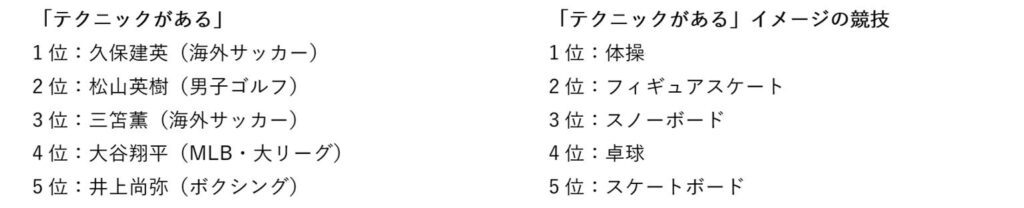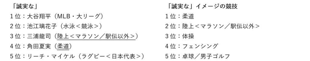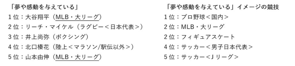 アスリート個別イメージでは、「華やかな」で坂本花織(フィギュアスケート)、「誠実な」で大谷翔平(MLB・大リーグ)、「可愛い」で早田ひな(卓球)、「清潔な」で山下美夢有(女子ゴルフ)、「リーダーシップがある」でリーチ・マイケル(ラグビー<日本代表>)、「テクニックがある」で久保建英(海外サッカー)、「勢いを感じる」と「夢や感動を与えている」で大谷翔平(MLB・大リーグ)が1位となりました。