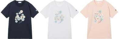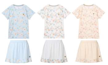「クリザンテーム」を散らした華やかなデザインと、柔らかくストレッチ性に優れた素材が特徴のテニスウェアです。ゲームシャツには肩回りの動きに着目した独自のパターンや消臭テープを採用し、テニスに適した機能性をもたせています。いずれもJTA(日本テニス協会)の定めるウェア規定を満たしているので公式試合でも着用できます。