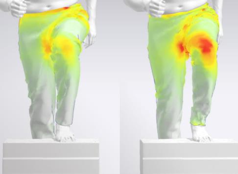 膝付近のストレスが軽減 ※赤が濃いほどストレスが大きい